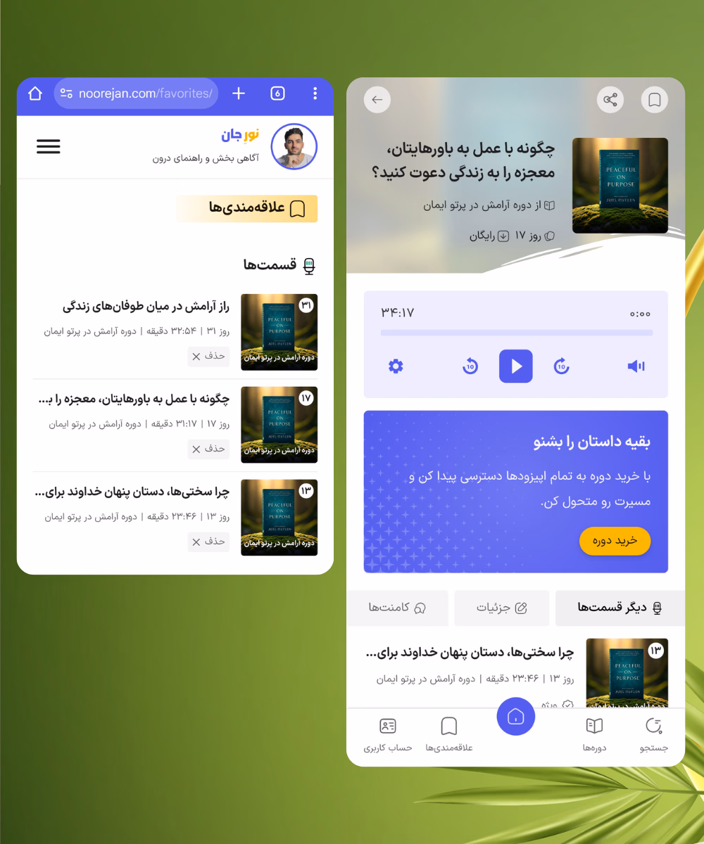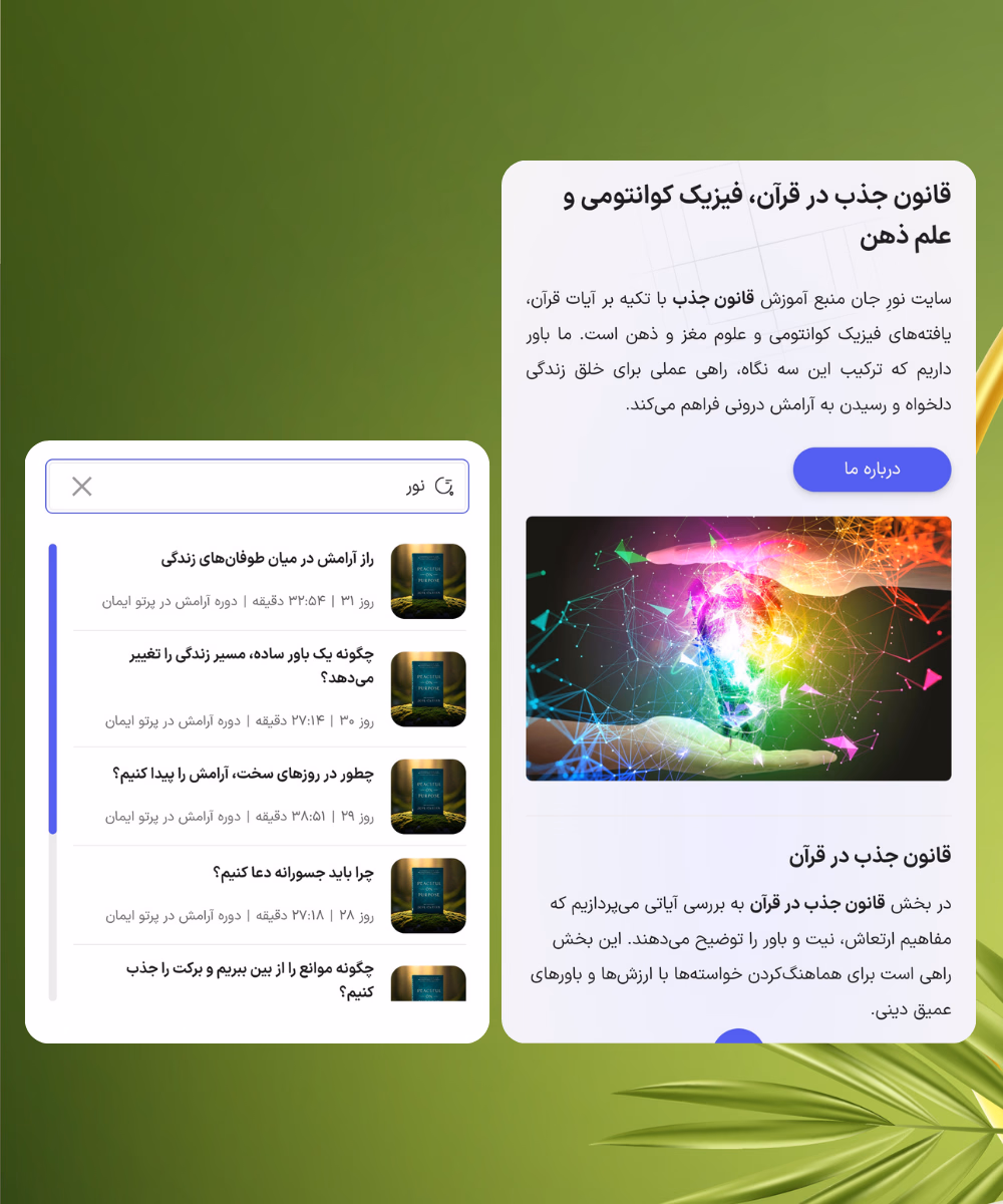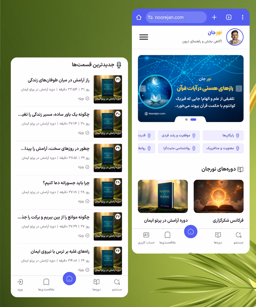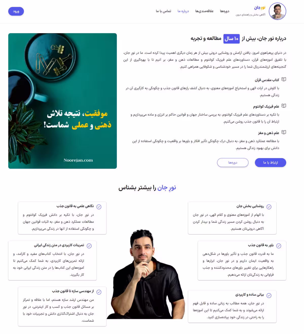 طراحی سایت نور جان (Noorejan.com) با تمرکز بر ارائه محتوای صوتی و تصویری (پادکستها، دورهها و اپیزودها) انجام شده است. این سایت با یک ظاهر بسیار حرفهای و زیبا، بستر مناسبی را برای یک سیستم اشتراکی قدرتمند و تعاملی فراهم کرده است که هم محتوای رایگان و هم دورههای آموزشی قابل تهیه را در اختیار کاربران قرار میدهد.